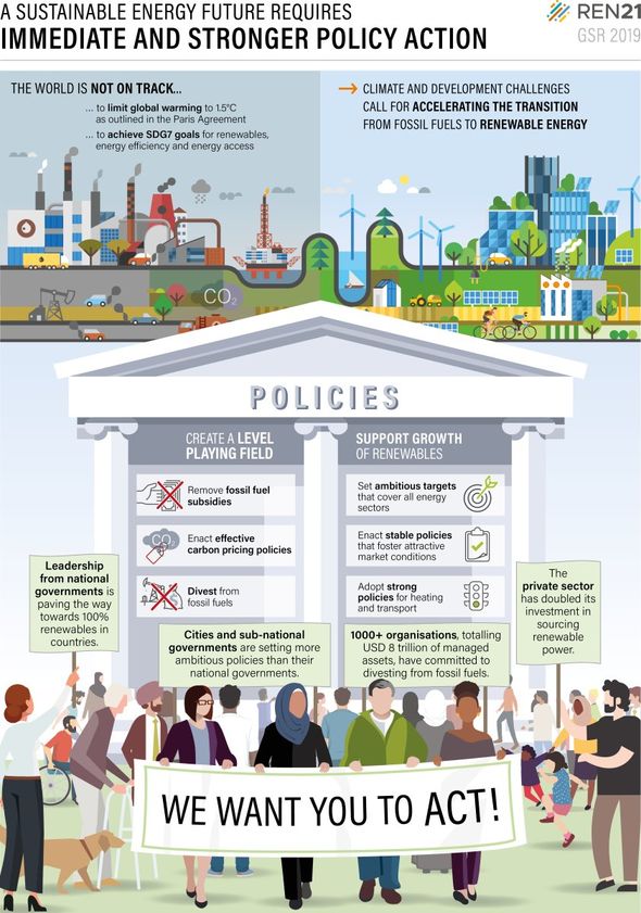 „Ein entscheidender Durchbruch könnte erzielt werden, wenn Länder ihre Subventionen für fossile Brennstoffe kürzen, die schmutzige Energie fördern“, sagt Rana Adib, Exekutivsekretärin von REN21. Eine ehrgeizige Politik und entsprechende rechtliche Rahmenbedingungen sind entscheidend für die Schaffung günstiger und wettbewerbsfähiger Bedingungen, damit der Anteil erneuerbarer Energien wachsen kann und diese teurere, kohlenstoffhaltige Kraftstoffe ersetzen können. Vierzig Länder haben seit 2015 in gewissem Umfang Reformen zur Verringerung ihrer Subventionen für fossile Energieträger durchgeführt, allerdings existierten solche Subventionen 2017 immer noch in 112 Ländern , wobei mindestens 73 Länder Subventionen in Höhe von jeweils über 100 Millionen US-Dollar gewährt haben. Die Subventionen für den Verbrauch fossiler Brennstoffe werden weltweit für 2017 auf insgesamt 300 Millarden US-Dollar geschätzt; dies entspricht einem Anstieg von 11 Prozent gegenüber 2016.