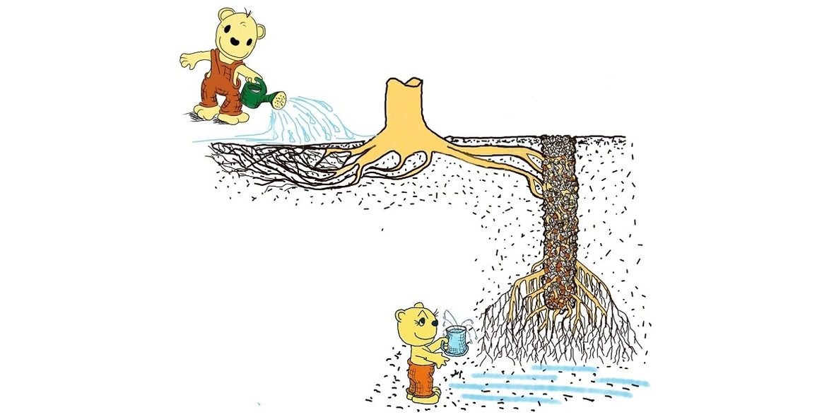 Baumwurzeln werden von feuchten Bodenbereichen angelockt, ein Phänomen, das als Hydrotropismus bekannt ist. Oberflächliches Bewässern führt deshalb dazu, dass Wurzeln nahe der Oberfläche bleiben, statt in die Tiefe zu wachsen. Biomechaniker des KIT haben ein leicht anzuwendendes Verfahren entwickelt, mit dem die Baumwurzeln in tiefere, feuchtere Bodenschichten gelockt werden.