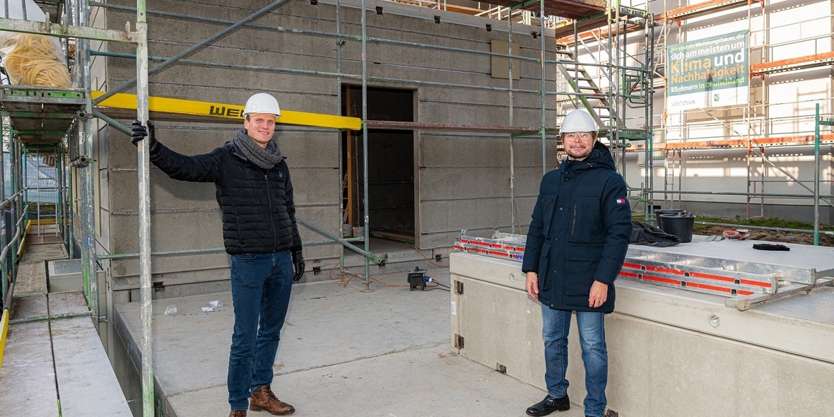 Freuen sich, dass der Bau der Energiezentrale der Zukunft (EZZ) in Bochum-Weitmar zügig vorangeht: Tobias Hofmann, Leiter Quartierssysteme bei Vonovia (l.), und Michael Klöpsch, Regionalbereichsleiter Ruhrgebiet-Süd, konnten jetzt Richtfest für das Zukunftsprojekt von Vonovia feiern.