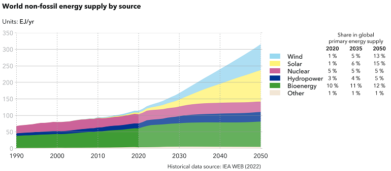 Die Stromerzeugung wird sich mehr als verdoppeln und ihr Anteil am globalen Energiemix wird in den nächsten 30 Jahren von 19 Prozent auf 36 Prozent steigen. Solar- und Windenergie sind an den meisten Standorten bereits die billigste Form der Stromerzeugung. Bis 2050 werden sie um das zwanzig- beziehungsweise zehnfache wachsen und die Stromerzeugung mit einem Anteil von 38 Prozent beziehungsweise 31 Prozent dominieren. Es wird erwartet, dass sich die Ausgaben für erneuerbare Energien in den nächsten zehn Jahren auf über 1300 Milliarden USD pro Jahr verdoppeln werden, und die Ausgaben für das Stromnetz werden 2030 wahrscheinlich 1000 Milliarden USD pro Jahr übersteigen. Die Sorge um die Energiesicherheit führt zu einem erneuten Interesse an der Kernenergie. Die diesjährige Prognose spiegelt einen bescheidenen Aufschwung wider, der bis 2050 um 13 Prozent gegenüber dem heutigen Stand zunimmt. Der Anteil der Kernenergie am Strommix wird jedoch von heute zehn Prozent auf fünf Prozent im Jahr 2050 sinken.