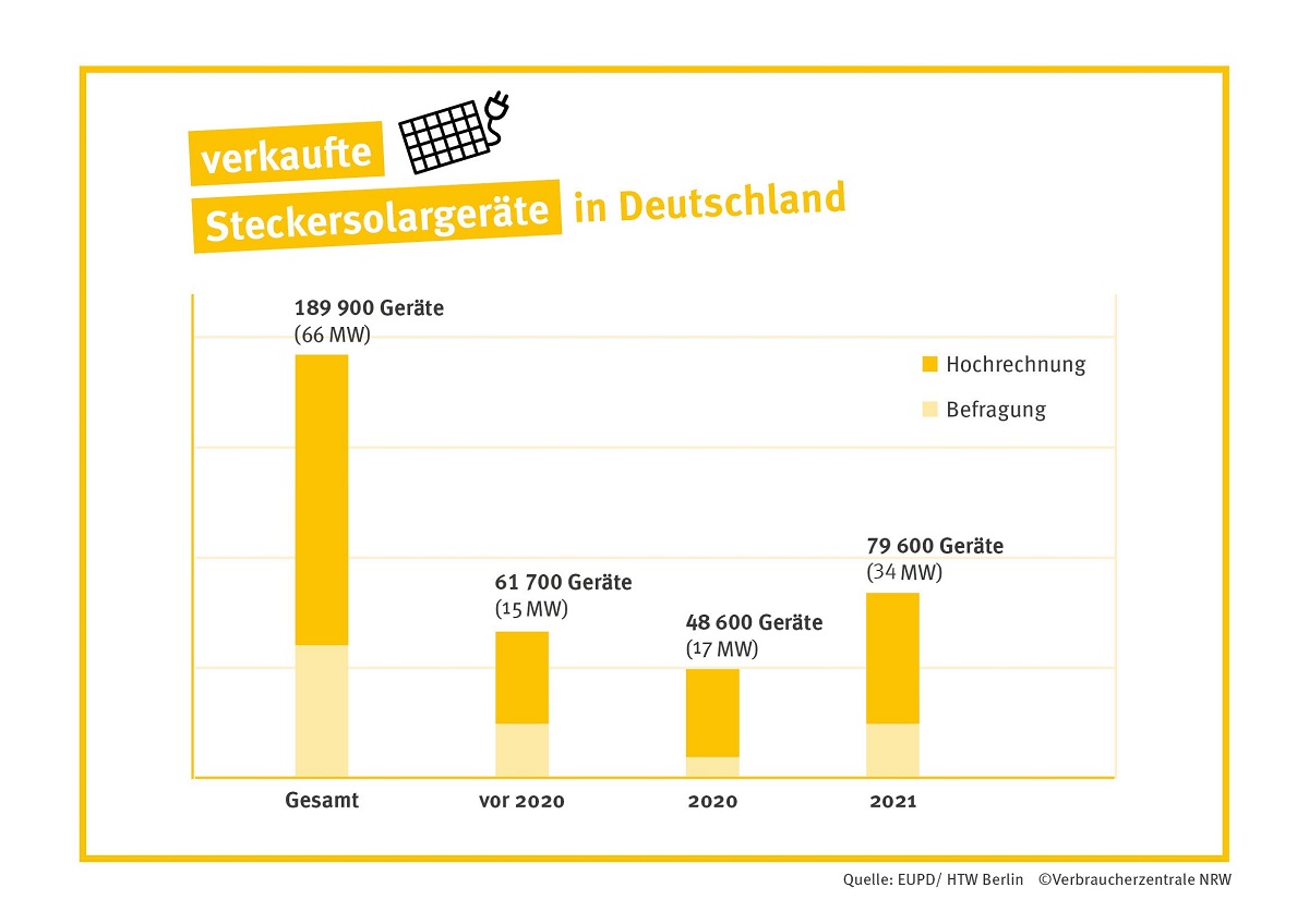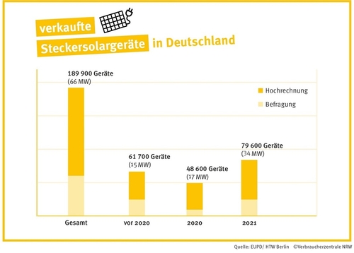 Allein in den Jahren 2020 und 2021 wurden demnach bis zu 128 000 Steckersolargeräte mit einer Leistung von bis zu 51 Megawatt verkauft. Alle bisher in Deutschland verkauften Geräte erreichen eine Leistung von bis zu 66 Megawatt.