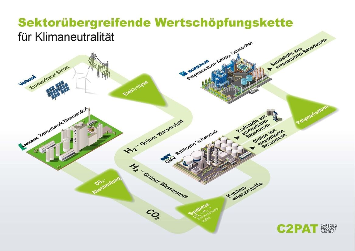 In ihrer Absichtserklärung einigen sich die Industrieunternehmen Lafarge, OMV, VERBUND und Borealis auf eine branchenübergreifende Zusammenarbeit im Projekt „Carbon2ProductAustria“, kurz C2PAT. Ziel des Projektes ist die Schaffung einer sektorübergreifenden Wertschöpfungskette sowie die Errichtung einer Anlage im industriellen Maßstab bis 2030, welche eine Abscheidung von nahezu 100 Prozent des jährlichen Ausstoßes im Zementwerk Mannersdorf (NÖ) von 700.000 Tonnen CO2 ermöglicht. Das abgeschiedene CO2 stünde so als Ressource zur Verfügung.