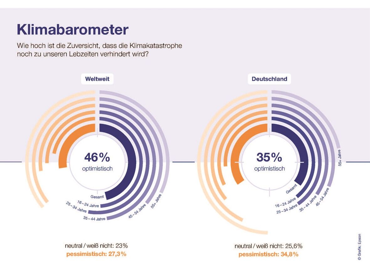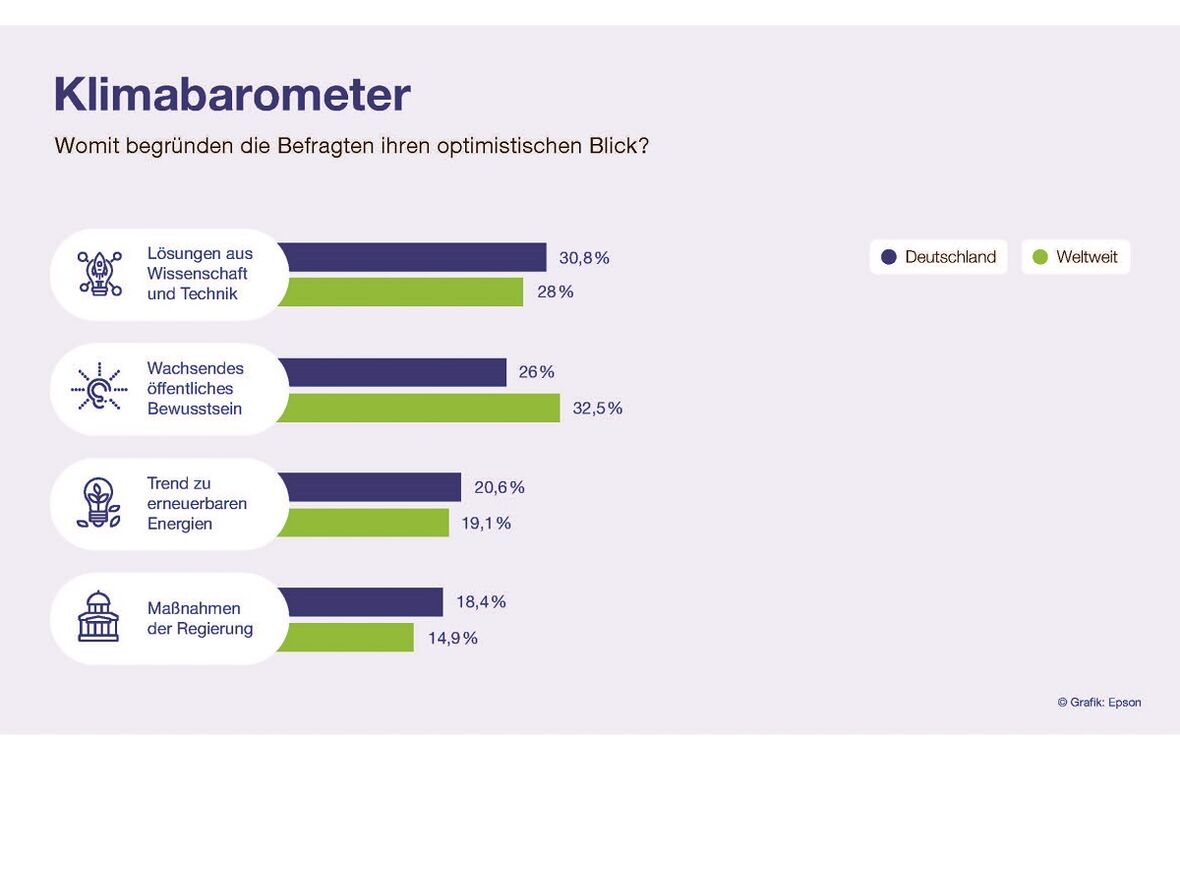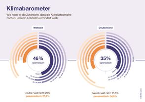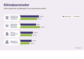 Begründet wird der optimistische Blick weltweit ähnlich. Das Vertrauen in Lösungen durch Wissenschaft und Technik liegt bei den deutschen befragten Optimisten auf Platz eins (31 Prozent, weltweit 28 Prozent), gefolgt von einem wachsenden öffentlichen Bewusstsein für den Klimawandel (26 Prozent, weltweit 32 Prozent) und dem Trend hin zu erneuerbaren Energien (21 Prozent, weltweit 19 Prozent). Die Maßnahmen der Regierung werden erst an vierter Stelle – weltweit und in Deutschland – genannt (18 Prozent, weltweit 15 Prozent).