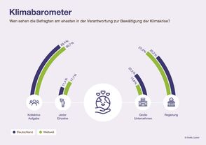 Viele sehen die Verantwortung, die Krise zu bewältigen, in den Händen von Staat und Wirtschaft. Besonders die deutschen Befragten sehen große Unternehmen in der Pflicht. Gefragt danach, wer ihrer Meinung nach am ehesten für die Bewältigung der Klimakrise verantwortlich ist, benennt jede*r Fünfte (22 Prozent, weltweit 15 Prozent) große Unternehmen – genauso viele sehen die Verantwortung bei Regierungen (22 Prozent, weltweit 27 Prozent). Die individuelle Verantwortung gerät hier deutlich ins Hintertreffen. Nur gut jede*r zehnte Befragte in Deutschland sieht den Einzelnen als Verantwortlichen. Einig sind sich die Befragten weltweit und in Deutschland: die Krise zu bewältigen ist eine kollektive Aufgabe (29 Prozent der Befragten in Deutschland, 31 Prozent weltweit).