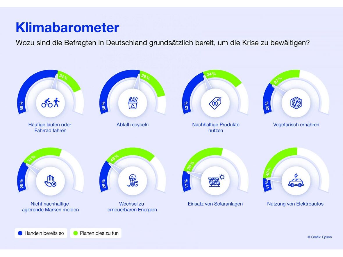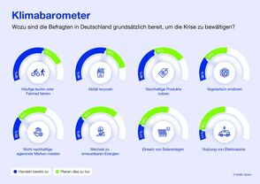 Die Umfrage zeigt, dass es in einigen Bereichen individuell schon zu Umstellungen kommt. Deutlich über die Hälfte der Deutschen gibt an, häufiger zu laufen oder mit dem Rad zu fahren (56 Prozent, 24 Prozent planen dies zu tun) und zu recyceln (56 Prozent, 29 Prozent planen dies zu tun). Mehr als 40 Prozent sagen, dass sie nachhaltigere Produkte nutzen (34 Prozent planen dies zu tun). Jede*r vierte Befragte in Deutschland sagt, dass er/sie sich vegetarisch ernährt (26 Prozent, 27 Prozent planen dies zu tun) und nicht nachhaltig agierende Marken meidet (25 Prozent versus 34 Prozent). Besonders große Unterschiede zwischen Absicht und wirklichen Taten sind bei dem Wechsel hin zu erneuerbaren Energien (26 Prozent versus 43 Prozent), dem Einsatz von Solarpanels (17 Prozent versus 39 Prozent) und der Nutzung von Elektroautos (elf Prozent versus 40 Prozent) zu erkennen.