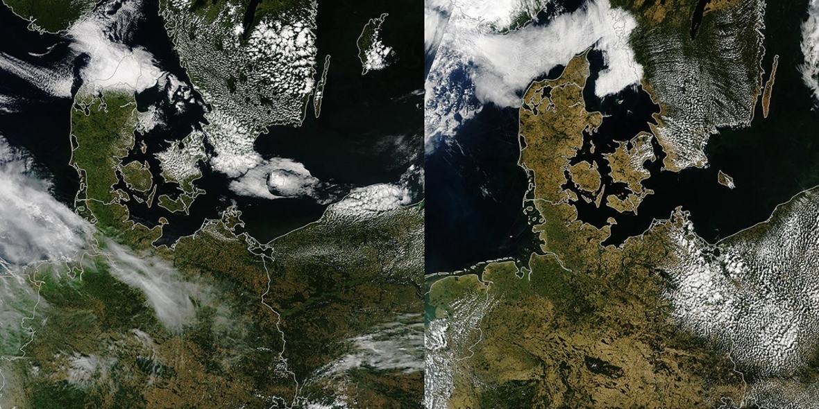 Hier wird ein Vergleich von Norddeutschland und Dänemark zwischen dem 19. Juli 2017 und dem 24. Juli 2018 gezeigt, und alle braunen Flächen (Echtfarben Image) deuten auf Dürre hin.