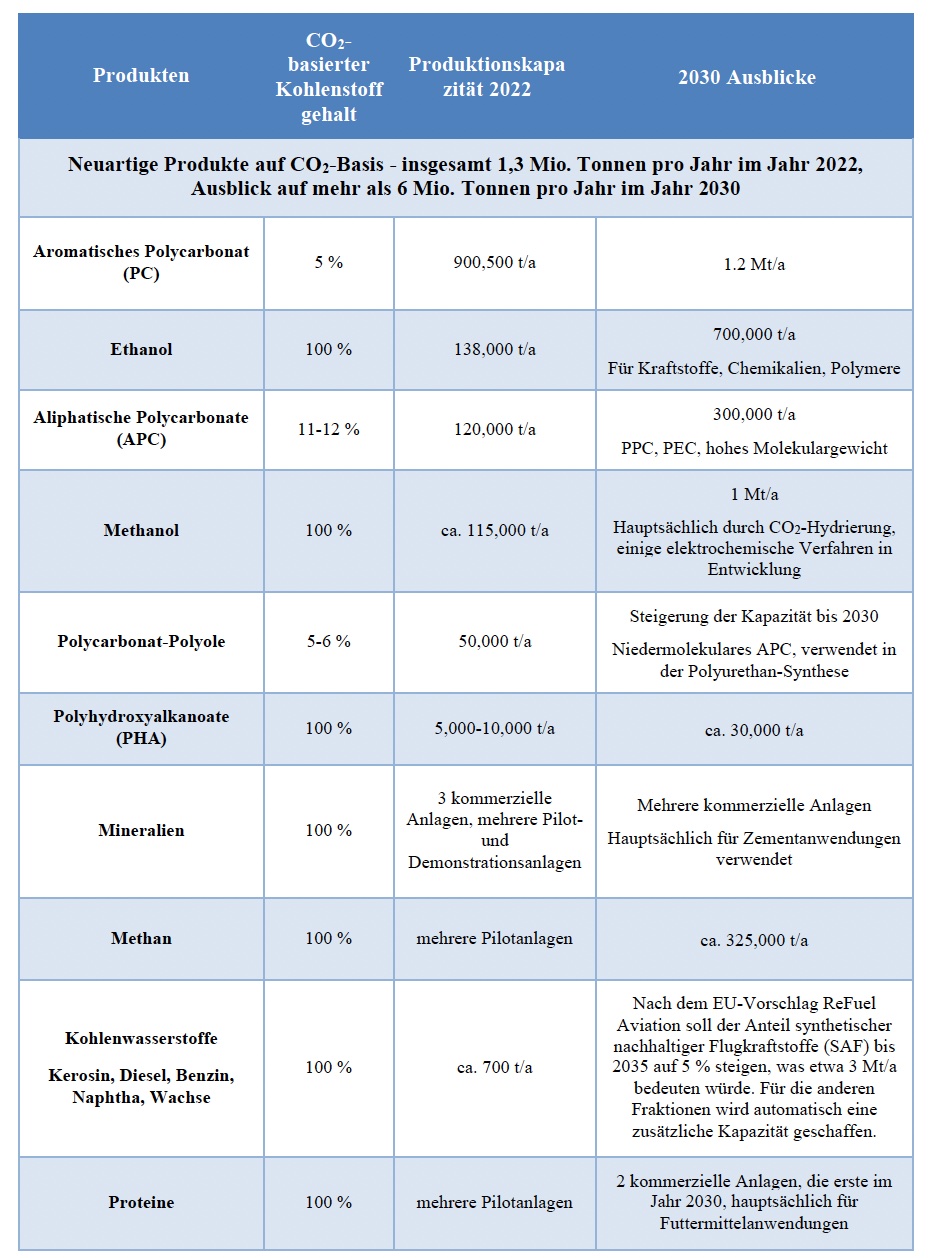 Die aktuelle Gesamtproduktionskapazität neuartiger CO2-basierter Produkte wird für 2022 auf circa 1,3 Megatonnen pro Jahr geschätzt. Hierbei wird die Produktionskapazität von der Herstellung CO2-basierter aromatischer Polycarbonate, Ethanol aus abgeschiedenem CO/CO2, aliphatischem Polycarbonat und Methanol dominiert. Die Kapazitätsprognose CO2-basierter Produkte bis 2030 wird geschätzt mehr als sechs Megatonnen pro Jahr betragen. Eine hohe Wachstumsdynamik zeigen in diesem Zusammenhang besonders Methanolprojekte, Methananlagen, Ethanol und Kohlenwasserstoffe – letztere insbesondere für den Luftfahrtsektor.