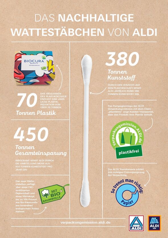 Die Unternehmensgruppen ALDI Nord und ALDI SÜD setzen sich weiterhin konsequent für die Reduktion des Plastikaufkommens ein: Im Rahmen der ALDI Verpackungsmission listen die Discounter die Wattestäbchen mit Plastikschaft aus und ersetzen diese durch ein nachhaltiges Produkt. Das neue Wattestäbchen verfügt über einen FSC-zertifizierten Papierschaft und einen Wattekopf, der zu 100 Prozent aus Bio-Baumwolle aus kontrolliert biologischem Anbau besteht. Durch den Verzicht auf den Plastikschaft spart ALDI jährlich rund 380 Tonnen Kunststoff ein. Auch bei der Verpackung der neuen Wattestäbchen wird komplett auf den Einsatz von Plastik verzichtet: Die Vollkartonbox besteht komplett aus FSC-zertifiziertem Papier. Nach Umstellung in beiden Unternehmensgruppen erzeugt das Weglassen des Plastikdeckels eine zusätzliche jährliche Plastikreduktion von mehr als 70 Tonnen. Insgesamt spart ALDI durch die Umstellung zukünftig mehr als 450 Tonnen Kunststoff pro Jahr ein.