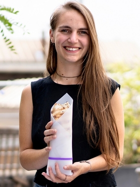„ReWrap“ von Sarah Klein (25 Jahre) kann große Mengen beschichtetes Papier und Aluminiumfolie bei der Verpackung von Wraps, belegten Baguettes, Falafel, Pommes und Burgern ersetzen. Die spül- und recycelbare Hülle aus Silikonkautschuk lässt sich flexibel falten und wickeln. Das Essen zum Mitnehmen ist geschützt und zugleich tropfen Fett und Saucen nicht heraus. Denkbar ist ein Einsatz im Pfandsystem oder die Konsument*innen bringen ihre einmal gekaufte Hülle, die in der Tasche wenig Platz wegnimmt, jeweils zum Imbiss mit. „Durch die einfache Handhabung und das schlichte Design besteht mit ,ReWrap‘ die Möglichkeit, dass neue, junge Zielgruppen für nachhaltigeren Konsum sensibilisiert werden“, urteilte die Jury.