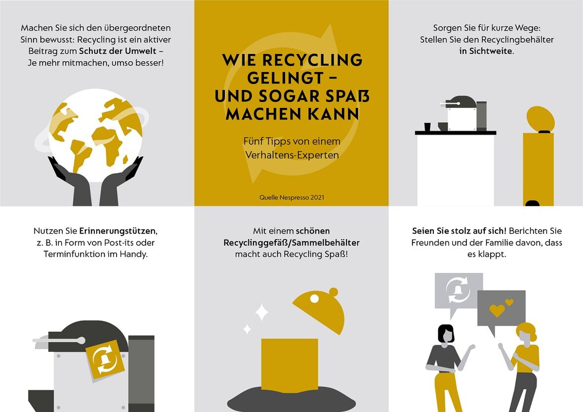 Im eigenen Alltag können Verbraucherinnen und Verbraucher sich klar machen, was ihre individuellen Hemmschwellen sind und sie aktiv angehen. Ein Beispiel: Platzieren Sie die Kaffeemaschine in Sichtnähe zur Gelben Tonne. „Auch eine Erinnerungsstütze in Form eines Post-its kann helfen. Oder ein besonders schöner, praktischer Behälter, in dem Sie die Kapseln und Verpackungen sammeln", führt Prof. Schilbach aus. „Damit Handlungen zur Gewohnheit werden müssen sie einfach durchzuführen sein und Spaß machen! Easy & fun, könnte man sagen."