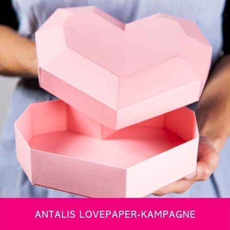 Auch Antalis unterstützt LovePaper. Zum Valentinstag 2021 präsentierte das Unternehmen herzförmige Faltschachtelverpackungen aus feinen Antalis Kreativpapieren in Form des LovePaper-Logos. Diese tauchen in mehreren Snack-Content-Videos auf, die Antalis auf Instagram, YouTube und LinkedIn zeigt.