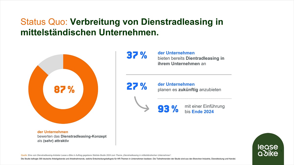 Die Ergebnisse der Studie sind eindeutig: Das Dienstradleasing ist auf dem Vormarsch und erfreut sich großer Popularität. So halten neun von zehn Personalverantwortlichen (87 Prozent) das Konzept des Dienstradleasings für besonders attraktiv. Nach Angaben von 37 Prozent der Befragten ist das Dienstradleasing in ihrem Unternehmen bereits möglich. Weitere 27 Prozent planen, solche Angebote in Zukunft zu implementieren – 93 Prozent davon bis Ende 2024.