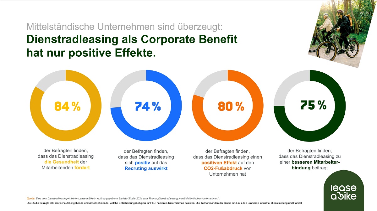 Eine aktuelle Studie von Statista, die im Auftrag von Lease a Bike durchgeführt wurde, bestätigt die zunehmende Beliebtheit von Corporate Benefits im Mobilitätsspektrum, insbesondere des Dienstradleasings. Im Rahmen einer quantitativen Online-Befragung wurden über 300 deutsche Arbeitgebende und Arbeitnehmende aus den Bereichen Industrie, Dienstleistung und Handel befragt, die in Unternehmen Personalentscheidungen treffen.