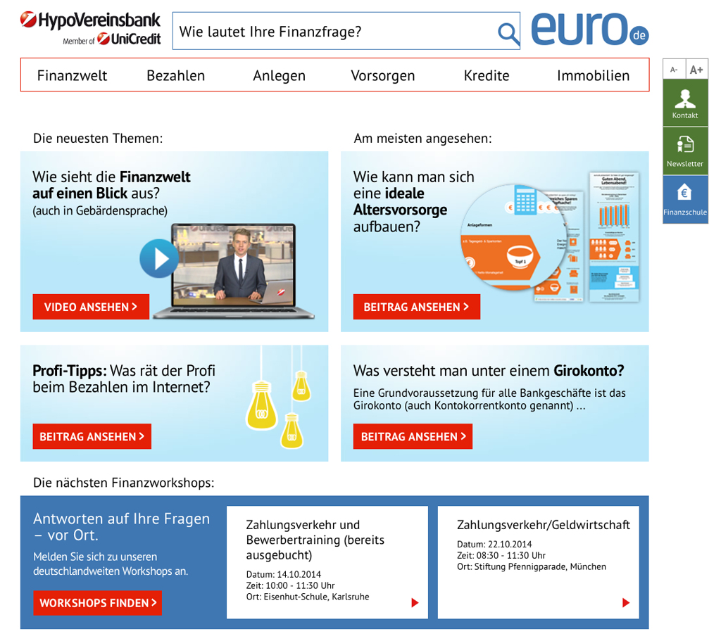 Um den Lesern die Zusammenhänge von Wirtschaftsprozessen und Finanzwelt begreiflich zu machen, beleuchtet die Homepage euro.de sechs Themenbereiche: Diese reichen von den Grundlagen des Geldkreislaufs, über Geldanlagen, Kredite, Immobilien, Finanzwelt im Allgemeinen bis hin zur Altersvorsorge. Darüber hinaus bietet die Bank auch ein Modul „Mein Geld und ich – Basiswissen“ an, das sich speziell an Schüler und Auszubildende richtet: „Dieses beinhaltet die wichtigsten Informationen zum Zahlungsverkehr, aber auch zum Thema Verschuldung und Basis-Versicherungsschutz“, so die HypoVereinsbank weiter.