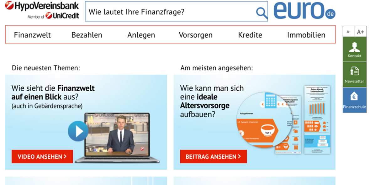 Die Website ist einfach und übersichtlich strukturiert und gibt übergreifend und informativ Antworten auf verschiedene Finanzfragen. Sie wurde im August komplett überarbeitet und ist jetzt barrierefrei programmiert. So ermöglicht die HypoVereinsbank auch Menschen mit körperlichen Beeinträchtigungen den Zugang zu Finanzwissen. Unter anderem wurden dafür die Videos in Gebärdensprache übersetzt.