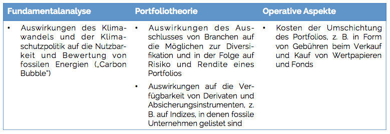 Neben ethischen und gesellschaftspolitischen Aspekten spielen gerade nach den Entscheidungen der Weltklimakonferenz in Paris ökonomische Gesichtspunkte bei einem Ausstieg aus fossilen Unternehmen eine zunehmend wichtigere Rolle. Dabei können drei Entscheidungsdimensionen unterschieden werden: eine fundamentalanalytische, eine portfoliotheoretische und eine operative Dimension. In der Gesamtschau dieser Dimensionen muss jeder Investor selbst entscheiden, welche Konsequenzen er aus dem Klimawandel für sein Portfolio zieht und zu welchem Zeitpunkt er aktiv wird. Klar ist: Die Beschlüsse von Paris haben ein Platzen der Kohlenstoffblase wahrscheinlicher gemacht. Die Wertpapiere fossiler Unternehmen könnten für Investoren, die darauf keine strategische Antwort finden, im Depot zu einem "Schwarzen Peter" werden.
