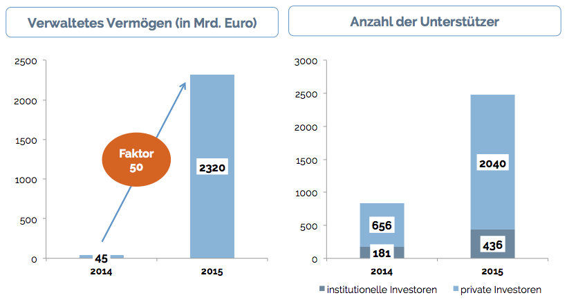 Die Breite der Bewegung analysiert regelmäßig die Beratungsgesellschaft Arabella Advisors, die zuletzt im September 2015 eine entsprechende Marktstudie vorgelegt hat. Danach ist die Zahl der offiziellen Unterstützer der "Divest Invest"-Kampagne auf knapp 2.500 gestiegen, darunter etwa 450 institutionelle Investoren. Das von den Unterstützern verwaltete Vermögen hat sich binnen Jahresfrist auf aktuell über 2,3 Billionen US-Dollar (rund 2,1 Billionen Euro) verfünfzigfacht. Zum Vergleich: Weltweit werden nach Angaben der Global Sustainable Investment Alliance (GSIA) rund 13 Billionen Euro unter Nutzung von Ausschlusskriterien verwaltet.