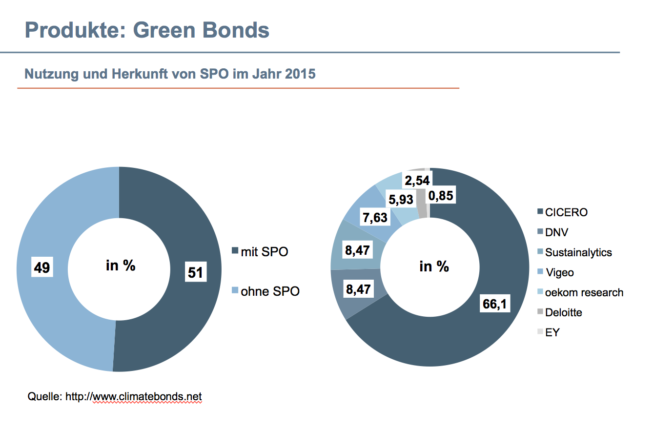 In diesem Bereich hatte im Jahr 2015 das Center for International Climate and Environmental Research Oslo, kurz CICERO, eine dominierende Stellung. Zwei Drittel der 2015 in Auftrag gegeben SPO wurden von der norwegischen Institution erstellt. Auf Rang 2 kommen mit einem Marktanteil von 8,47 Prozent die ebenfalls in Norwegen beheimatete DNV sowie die Nachhaltigkeits-Ratingagentur Sustainalytics. Mit Vigeo und oekom research folgen zwei weitere auf Nachhaltigkeitsaspekte spezialisierte Agenturen auf den Rängen 4 und 5. Für diese Agenturen stellt die bezahlte Erstellung von Gutachten für Unternehmen teilweise eine Erweiterung des Geschäftsmodells dar, haben sie doch bisher im Auftrag der Investoren gearbeitet und nicht der Emittenten.
