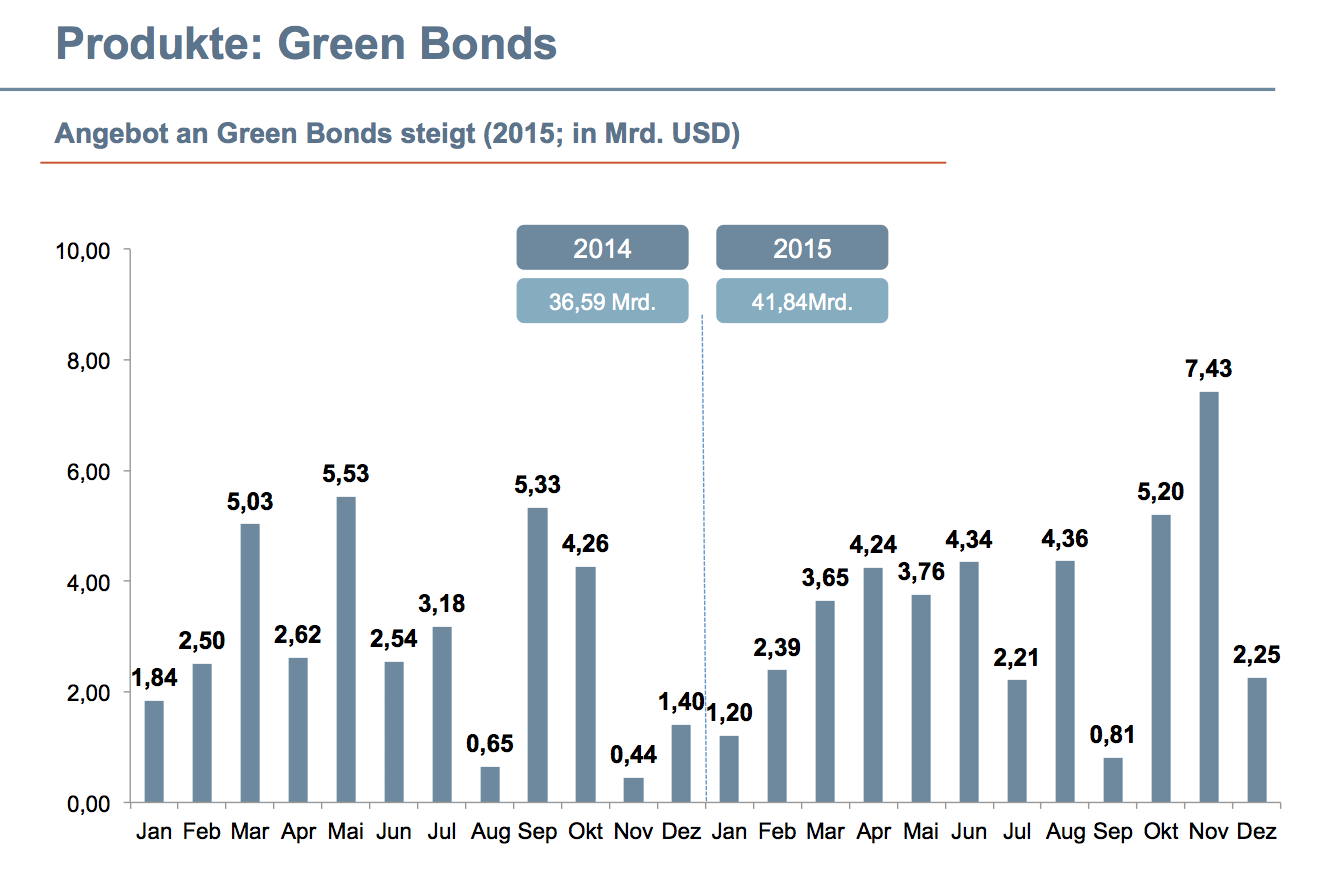 Auch wenn der Markt für Green Bonds die hoch gesteckten Erwartungen im Jahr 2015 nicht ganz erfüllen konnte, hat sich das Volumen dieser Anleihen in den vergangenen Jahren sukzessive erhöht. So stieg das Emissionsvolumen von gut 37 Milliarden US-Dollar im Jahr 2014 auf knapp 42 Milliarden US-Dollar im vergangenen Jahr. Für 2016 erwarten Experten einen Anstieg des Volumens auf bis zu 100 Milliarden US-Dollar – dies war allerdings auch schon für 2015 als Ziel ausgegeben worden.