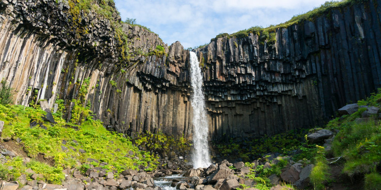 Am Fuße des Gletschers Vatnajökull liegt auch der Skaftafell-Nationalpark. Dieser lässt sich mit Karten aus dem Besucherzentrum und auf gut markierten Wegen erkunden. Nach kurzer Wanderung gelangt man zum Svartifoss (schwarzer Wasserfall), der sich über eine schroffe Felskante ergießt. Diese besteht aus langen Basaltsäulen, die in ihrer Gestalt an Orgelpfeifen erinnern.