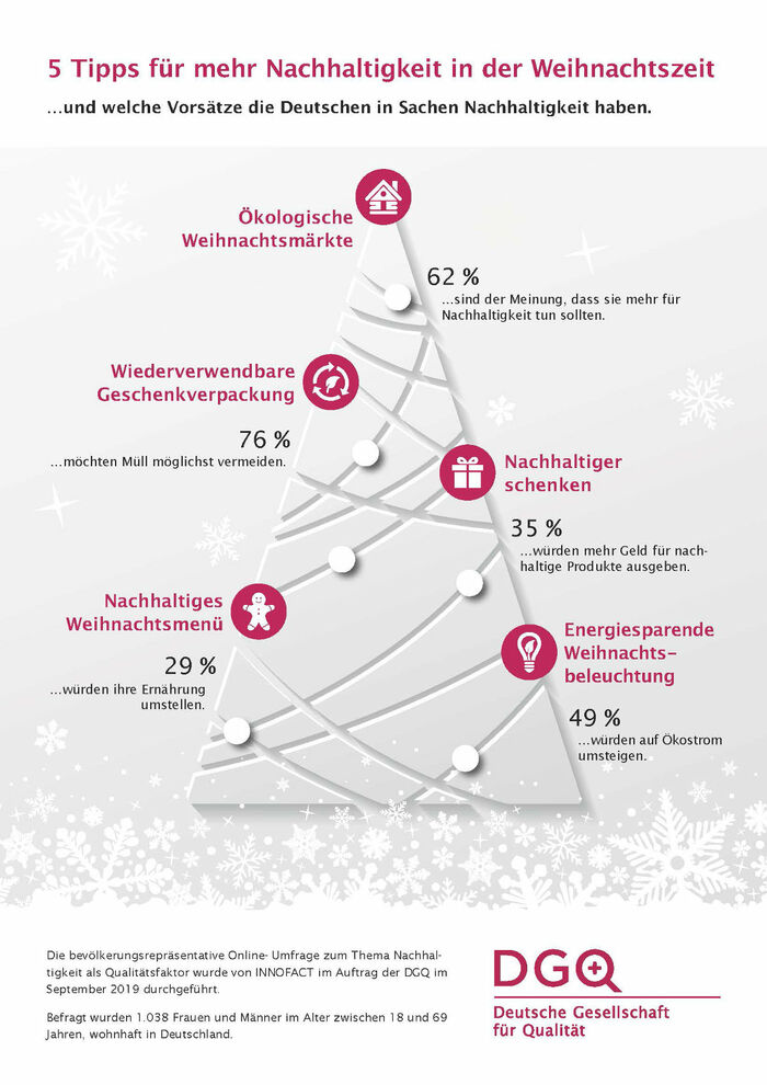 Viele Deutsche fühlen sich zudem noch zu wenig informiert, um im Alltag selbst nachhaltig handeln zu können (43 Prozent). Die Deutsche Gesellschaft für Qualität (DGQ) gibt fünf Tipps, mit denen sich die Weihnachtszeit nachhaltiger gestalten lässt und zeigt in welchen Bereichen die Deutschen laut Umfrage bereits gute Vorsätze beim Thema Nachhaltigkeit gefasst haben.