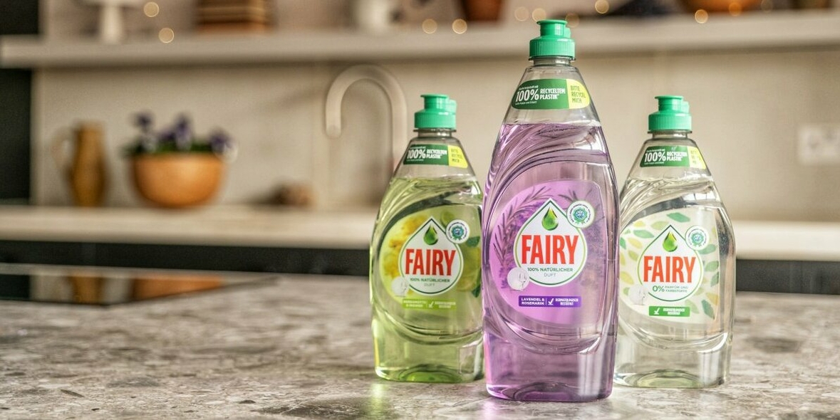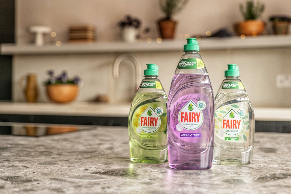 Die drei neuen Geschirrspülmittel von Fairy enthalten wie alle Varianten biologisch abbaubare Reinigungstenside und überzeugen mit derselben, ausgezeichneten Spülleistung, die Konsumenten von Fairy kennen – und das jetzt sogar in nur lauwarmem Wasser. Die neuen Flaschenkörper bestehen zu 100 Prozent aus recyceltem Kunststoff und sind vollständig recycelbar. Hergestellt werden sie zu 100 Prozent mit erneuerbaren Energien.