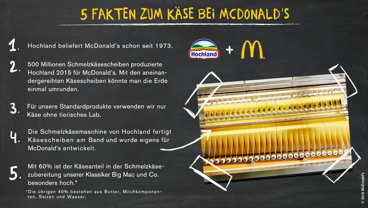 Ob Cheesburger, Pommes Frites oder Big Salad: Hinter jedem Produkt von McDonald's steht eine komplexe Lieferkette. "Manche nennen es Lieferkette. Wir bei McDonald's haben eine Qualitätskette. Ganz nach dem Motto 'Beste Partner. Beste Zutaten.' schließt sie alle unsere Lieferanten mit ein", erläutert Unternehmenssprecher Philipp Wachholz. In einer Porträtreihe stellt McDonald's Deutschland im Laufe des Jahres seine wichtigsten Partner vor. Den Auftakt bildet jetzt das Allgäuer Unternehmen Hochland, das McDonald's mit seiner Cheddar-Schmelzkäsezubereitung beliefert – und das seit mehr als vierzig Jahren.