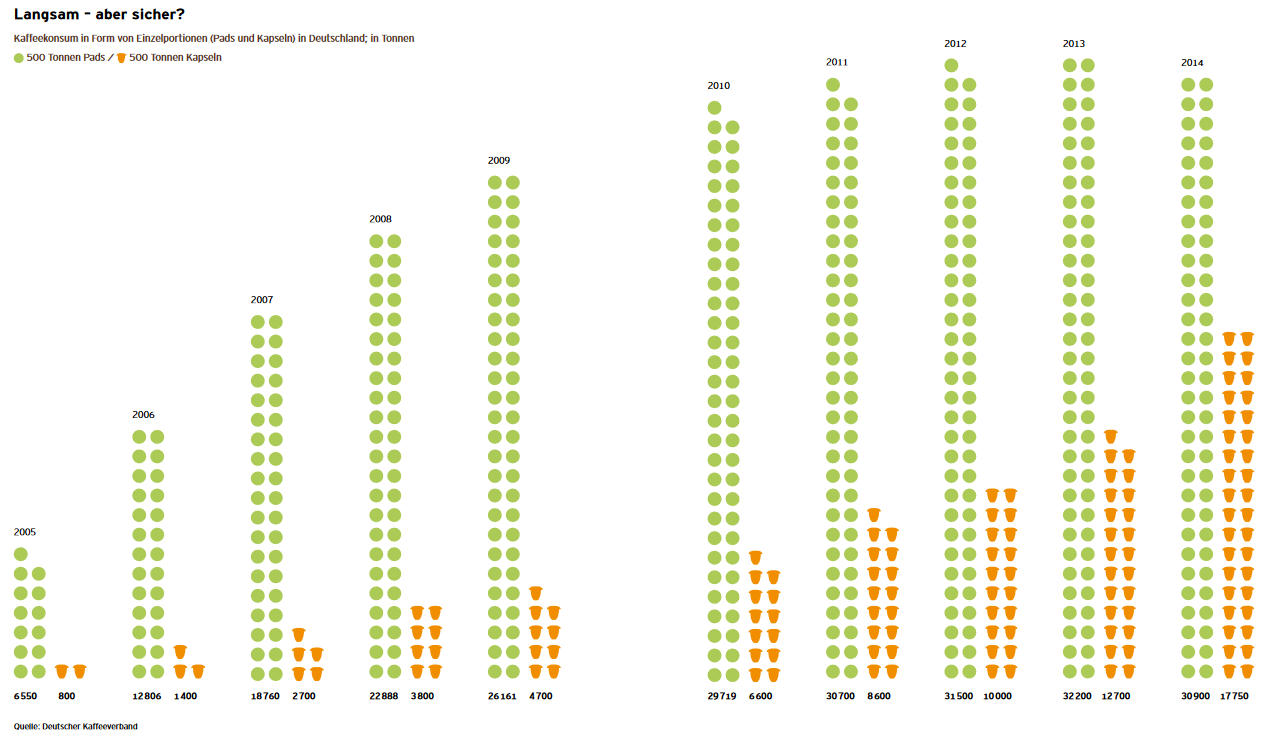 Während bei den Portionsmaschinen für zuhause lange Zeit Kaffeepads den Markt beherrschten, wächst die Beliebtheit von Kaffeekapseln. Der Geschmack sei besser und jede einzelne Tasse lasse sich damit so individuell zubereiten, wie der Kaffeeliebhaber sie will.