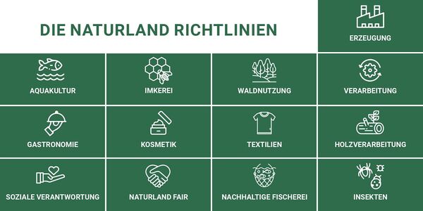 So hat Naturland etwa Kriterien für bestimmte Bereiche wie die Imkerei, Aquakultur und eine nachhaltige Fischerei entwickelt. Eine Besonderheit sind die „Naturland Fair“-Richtlinien, eine Zusatzqualifizierung mit dem Schwerpunkt auf fairen Preisen, verlässlichen Handelsbeziehungen und sozialer Verantwortung.