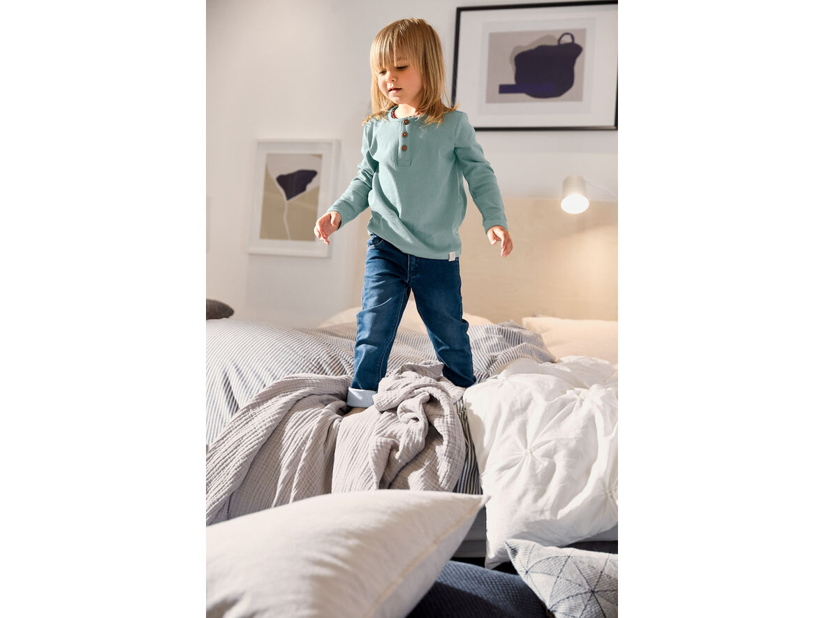 Das Familienunternehmen, das bereits seit Langem regelmäßig Kindermode in seinen Shops anbietet, hat sein Kinderbekleidungssortiment neu geordnet. Mit zwei Hauptkollektionen pro Jahr und zusätzlichen saisonalen Angeboten wendet sich der Tchibo-Online-Shop an Eltern, die ihre Kinder schick anziehen und außerdem verantwortungsvoll einkaufen wollen. Denn der Einzelhändler verspricht, dass alle angebotenen Produkte in den Größen 50/56 bis 120/128 fair hergestellt und besonders langlebig sind sowie aus zertifizierter Bio-Baumwolle oder aus recyceltem Material bestehen. Dafür wird mit dem GOTS und dem Grünen Knopf zusammengearbeitet. Das 2019 eingeführte staatliche Textilsiegel prüft verantwortungsvolle Unternehmen und zeichnet nachhaltig sozial und ökologisch produzierte Textilien aus.