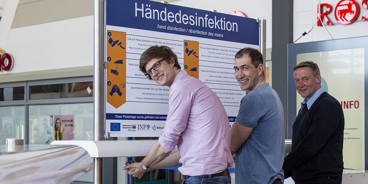 Im Zuge der Corona Pandemie gewinnt ein neuartiges Desinfektionsverfahren der Firma Nebula Biocides GmbH, einer Ausgründung des Leibniz-Institutes für Plasmaforschung und Technologie e.V. (INP), zunehmend an Bedeutung. Die erste Pilotanlage wurde Mitte April im Rahmen eines Testlaufs im Einkaufszentrum Elisen Park in Greifswald präsentiert.