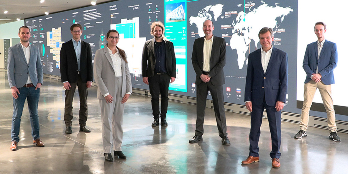 Wilo-Mitarbeiter David Graurock und Dr. Martin Oettmeier, beide Technology Monitoring & Evaluation, mit Dr. Stefan Michaelis, Geschäftsführer des „Kompetenzzentrum Maschinelles Lernen Rhein-Ruhr (ML2R)“ sowie Dr. Thorsten Kettner, R&D Strategy & Innovation bei der Wilo Gruppe (v.l.n.r.).