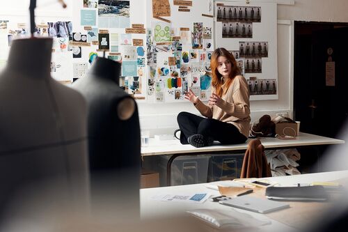 Zurück im Arbeitsraum in der Lampingstraße: Gegenüber der Kleiderstange hängt das „Visionboard“ von Anne-Marie Sust mit Fotos von Kleidungsstücken, Farbpaletten und Laboren. Dazwischen der Spruch „Good Design grows better with Age“ (Gute Designentwürfe werden mit der Zeit besser). Ein wichtiger Ansatz für die Arbeit.