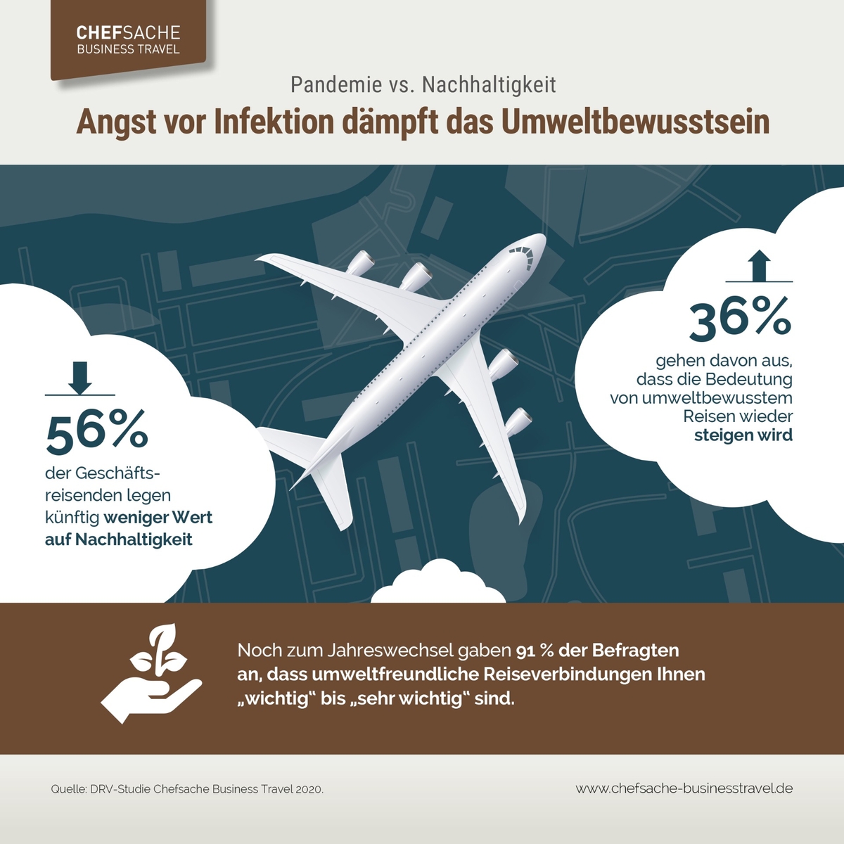 Über die Hälfte der Geschäftsreisenden meint nun, dass unterwegs künftig weniger Wert auf Nachhaltigkeit gelegt werden wird. Immerhin 36 Prozent sind überzeugt, dass die Bedeutung steigen wird, und elf Prozent glauben, dass sich nichts verändern wird. Das sind Ergebnisse der aktuellen Studie „Chefsache Business Travel 2020“, einer Initiative von Travel Management Companies im Deutschen Reiseverband (DRV).