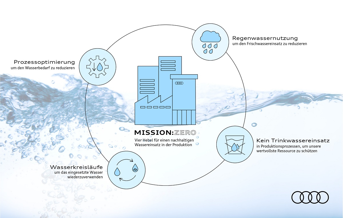 Dafür setzt Audi auf effiziente Prozesse, geschlossene Wasserkreisläufe und die verstärkte Nutzung von Regenwasser. Langfristig will Audi geschlossene Wasserkreisläufe an allen Produktionsstandorten umsetzen.