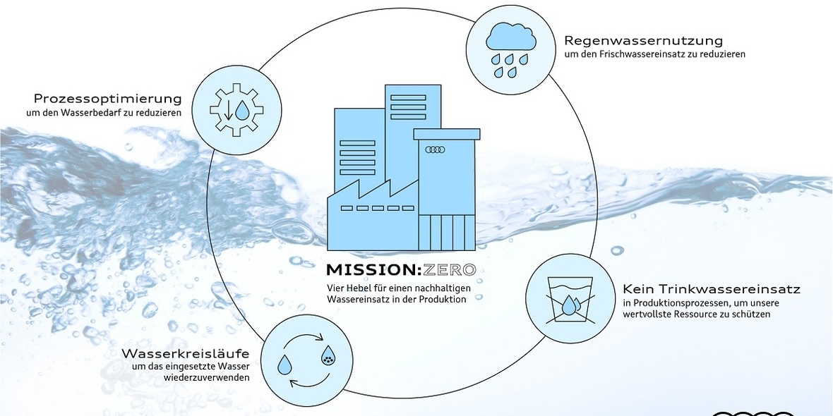 Sauberes Trinkwasser zählt zu den weltweit wertvollsten Ressourcen: Audi hat deshalb den sparsamen und effizienten Umgang mit Wasser als Schwerpunkt in sein Umweltprogramm Mission:Zero aufgenommen. Das Unternehmen will den eigenen Wasserverbrauch möglichst geringhalten und perspektivisch kein Trinkwasser mehr in der Fahrzeugproduktion verwenden.