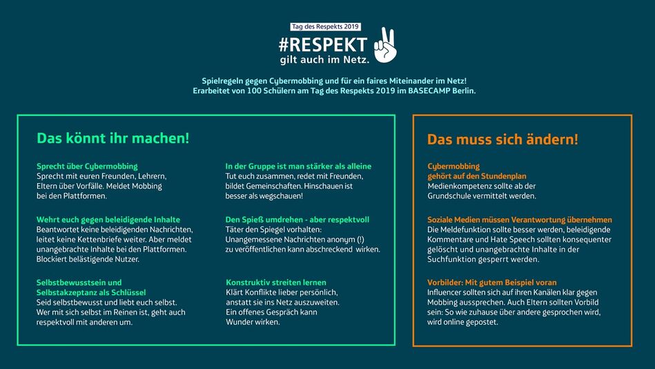Ein Zeichen gegen Cybermobbing und digitale Gewalt setzte Telefónica Deutschland am diesjährigen Tag des Respekts. Im BASECAMP in Berlin fanden sich am 18. September rund hundert Schülerinnen und Schüler zum Workshop „Spielregeln für ein digitales Miteinander“ zusammen. Moderator und Youtuber Mirko Drotschmann (MrWissen2go) offenbarte zu Beginn der Veranstaltung, dass er in der achten Klasse selbst einmal einen Mitschüler lächerlich gemacht habe. „Darauf bin ich heute überhaupt nicht stolz. Damals gab es noch kein Instagram, heute wäre es sicherlich ein Fall von Cybermobbing.“