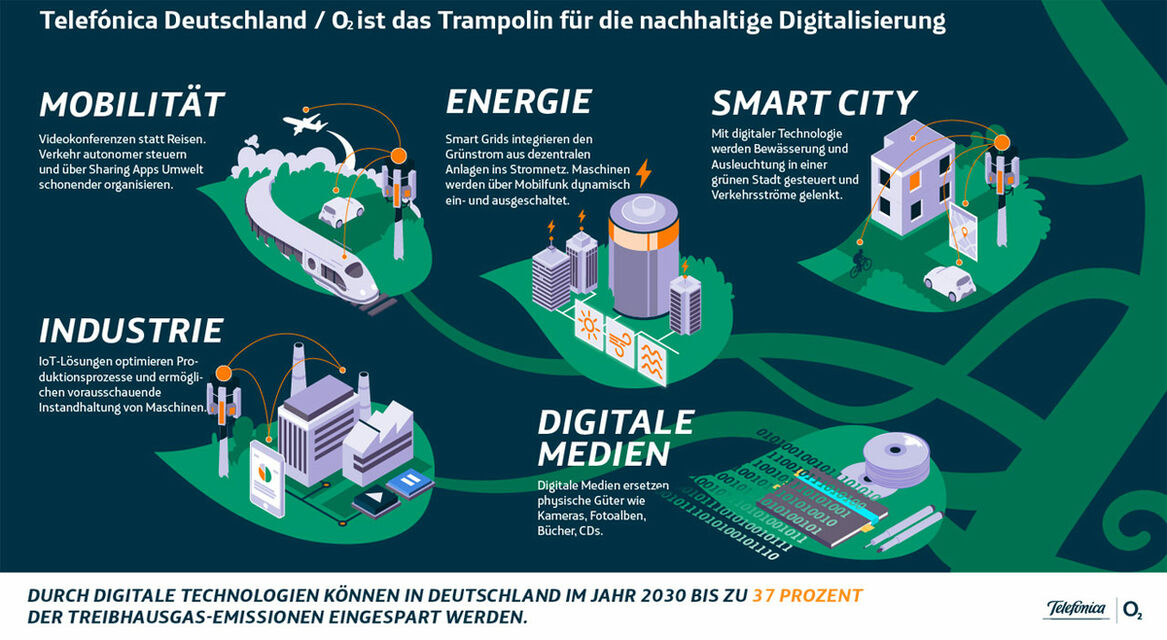 Jenseits der etablierten Industrieproduktion entwickeln Unternehmen neue digitale Produkte und Geschäftsmodelle, die den Wohlstand stärken und gleichzeitig der Verwirklichung von Nachhaltigkeitszielen dienen. Wayra, Telefónicas Start-up Accelerator, fördert solche Unternehmen, wie etwa Fold AI. Das Unternehmen erfasst mit Sensorendaten in Wäldern, auf deren Grundlage beispielsweise Förster über ein Dashboard, diverse Apps, und eine 5G-Übertragung den Zustand ihrer Bäume in Echtzeit erfassen. Mögliche Bedrohungen werden schon in der Entstehung erkannt und es kann ihnen entgegengewirkt werden. Die digitale Infrastruktur von Telefónica Deutschland / O2 und insbesondere der neue 5G-Standard sind das Trampolin, auf dem Unternehmen und Menschen derartige nachhaltige Anwendungen und Geschäftsmodelle verwirklichen.