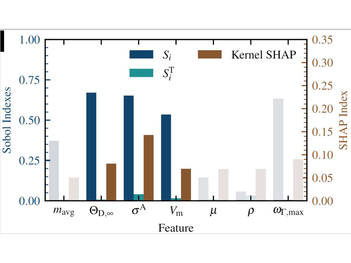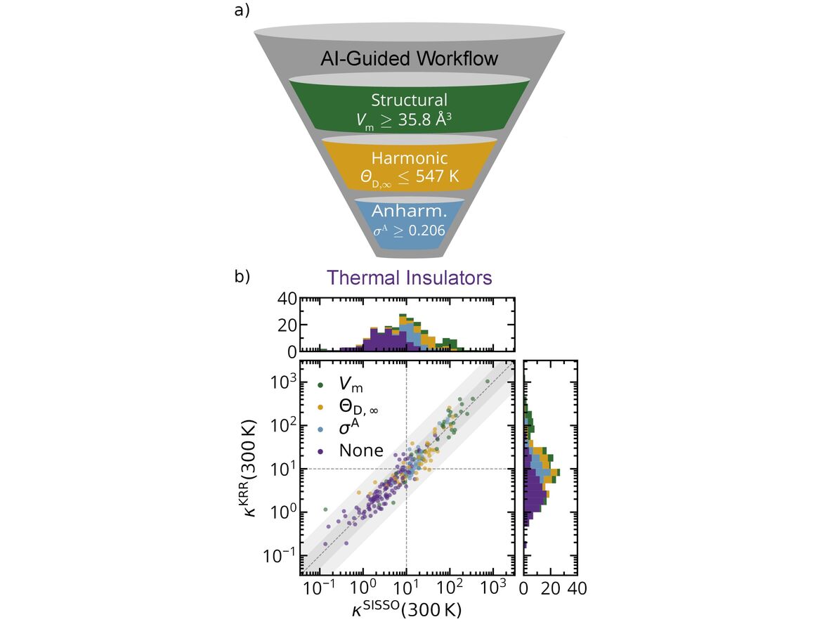 Der erste Schritt bei diesem neuartigen Ansatz besteht darin, fortgeschrittene statistische KI-Methoden zu verwenden, um die gewünschte Eigenschaft – in diesem Fall κ – zu modellieren. Zu diesem Zweck wird die „Sure-Independence Screening and Sparsifying Operator“ (SISSO) Methode verwendet, die die grundlegenden Abhängigkeiten zwischen verschiedenen Materialeigenschaften aus einer Vielzahl möglicher Zusammenhänge enthüllt. Dabei ist dieser Ansatz im Vergleich zu anderen „Black-Box“ KI-Modellen ähnlich genau, liefert aber zusätzlich noch analytische Beziehungen zwischen verschiedenen Materialeigenschaften. Dies ermöglicht es dann auch, mit modernen mathematischen Metriken herauszufinden, welche Materialeigenschaften unter welchen Umständen für welche Zieleigenschaft am einflussreichsten sind. Im Fall von κ sind dies das molare Volumen, Vm; die Debye-Temperatur im Hochtemperaturgrenzwert, θD,∞; und die Anharmonizitätsmetrik, σA, wie in Abbildung 1 dargestellt.