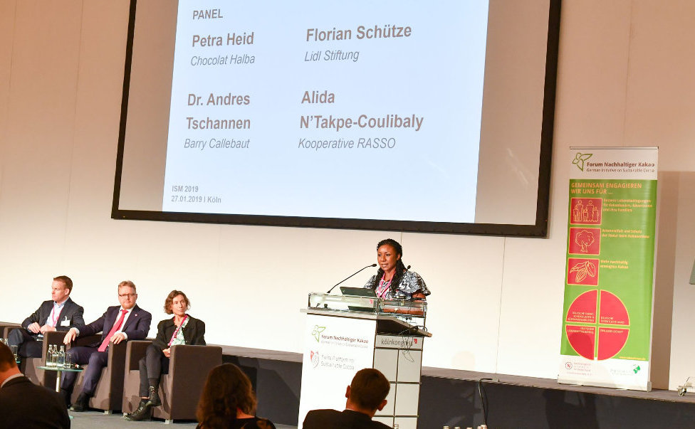Diese Frage diskutierten drei Vertreter der Süßwarenindustrie und des Lebensmittelhandels und eine Kooperativenvertreterin aus der Côte d’Ivoire auf einer gemeinsamen Veranstaltung des Forum Nachhaltiger Kakao und der Schweizer Plattform für Nachhaltigen Kakao auf der Internationalen Süßwarenmesse in Köln. Klar wurde für die rund 100 Teilnehmenden an der Diskussionsveranstaltung: Es gibt Fortschritte, vor allem was die Zusammenarbeit auf internationaler Ebene und zwischen den unterschiedlichen Akteuren aus Wirtschaft, Regierung und Zivilgesellschaft betrifft. Beispiel ist die Cocoa & Forests-Initiative zum Schutz vor Entwaldung. An ihr sind die Regierungen von mittlerweile drei kakaoproduzierenden Ländern, Côte d‘Ivoire, Ghana und Kolumbien, beteiligt, und es wurden anspruchsvolle nationale Umsetzungspläne entwickelt.