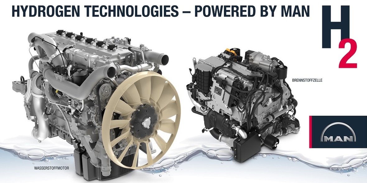 Abgesehen von der rasanten Weiterentwicklung der Batterietechnologie, stellt Wasserstoff (H2) für den Fernverkehr eine gute ergänzende Option als alternativer Kraftstoff dar, weshalb MAN Truck & Bus nun seine Entwicklungs-Roadmap hierzu vorstellt: Demnach sollen den aktuell laufenden Vorentwicklungsprojekten folgend bereits im kommenden Jahr Prototypen-Fahrzeuge aufgebaut werden. MAN erprobt hierbei sowohl den Einsatz einer Brennstoffzelle als auch eines H2-Verbrennungsmotors.