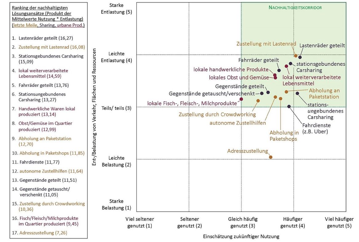 Ein Großteil der Befragten sprach sich für einen radikalen Wandel in der Stadtlogistik aus. Sie zeigten sich skeptisch gegenüber rein technologieorientierten (zum Beispiel Drohnen, unterirdische Zustellwege) oder marktgläubigen Ansätzen. Stattdessen plädierten sie für ein starkes Engagement der Kommunen, für regulatorische Eingriffe, für Kooperationen zwischen Staat und Wirtschaft, für eine intensive Beteiligung von Quartiersbewohnerinnen und -bewohnern, sowie für veränderte Konsumgewohnheiten.