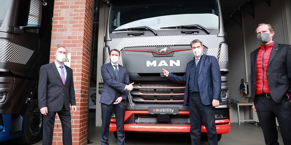 Zusätzlich zum schnelleren Hochlauf der Elektromobilität intensiviert der Nutzfahrzeughersteller seine Forschung im Bereich Wasserstoffmobilität. Dafür haben der bayerische Ministerpräsident Dr. Markus Söder gemeinsam mit Wirtschaftsminister Hubert Aiwanger eine Förderzusage in Höhe von 8,5 Millionen Euro für das Zukunftsprojekt „Bayernflotte“ überreicht. 2024 sollen dabei MAN-Lkw mit Wasserstoff-Brennstoffzellen bei fünf Kunden in Bayern ihre Eignung nachweisen.
