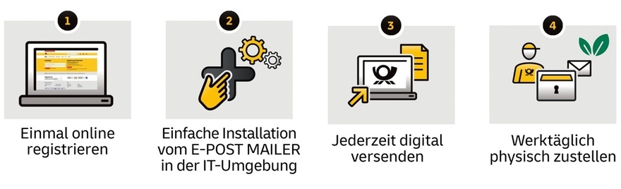 Der hybride Briefversand ist ganz einfach: Unternehmen oder Institutionen registrieren sich, ihre Mitarbeiter laden sich das Programm auf ihre Rechner und fortan ist der digitale Versand von physischen Briefen als eine Option im Druckmenü verfügbar – sowohl für Einzelsendungen als auch für große Sendungsmengen, Rechnungen oder Serienbriefe. Dabei eröffnen sich viele Gestaltungsspielräume: Farbdruck ist ebenso möglich wie ein beidseitiger Druck oder die Automatisierung von Überweisungsträgern.