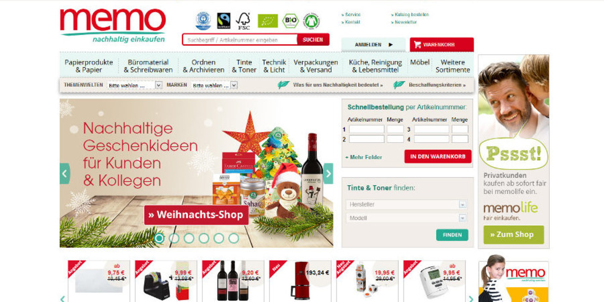 Die memo AG hat ihren Onlineshop für Gewerbekunden komplett neu gestaltet. Unter www.memo.de finden gewerbliche Endverbraucher ab sofort ein umfangreiches Angebot aus über 16.000 nachhaltigen Artikeln, darunter Bürobedarf, Schreibwaren, Büromöbel, EDV-Zubehör und vieles mehr.