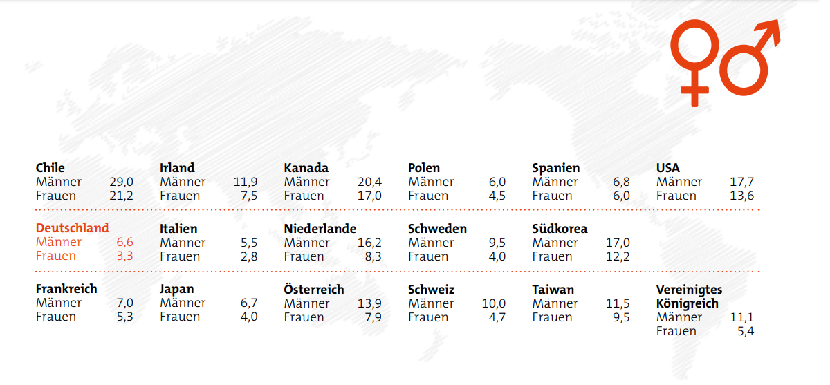 Die Daten der repräsentativen Bevölkerungsbefragung zeigen, dass 2018 in Deutschland lediglich 3,3 Prozent der Frauen während der letzten 3,5 Jahre ein Unternehmen gegründet haben und/oder sich in der Vorgründungsphase befinden. Im Vergleich dazu lag diese Quote unter den Männern bei 6,6 Prozent. Grundsätzlich wird in Deutschland, im Verhältnis zu anderen Ländern mit hohem Einkommen, wenig gegründet, wie die Daten des Global Entrepreneurship Monitors (GEM) zeigen. Das lässt sich unter anderem auf die insgesamt geringere Gründungsneigung in Deutschland zurückführen.